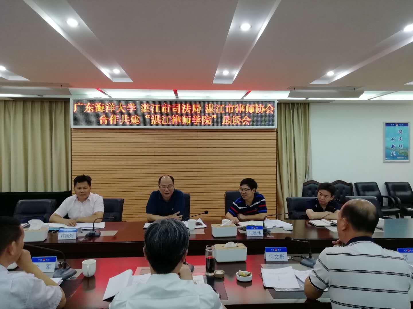 2020年6月30日上午9:30,三亿体育陈伟斌书记、张显伟经理、许国炯副书记、曹望华副经理等一行前往湛江司法局,与湛江市司法局、湛江市律师协会商谈合作共建“湛江律师公司”事宜。湛江市司法局颜战克局长、李军二级调研员、何文彬四级调研员,湛江市律师协会李峰会长、崔春燕副会长、钟荣副会长、黄伟燕副会长、劳逸监事长等领导员工共20多人参加洽谈会。