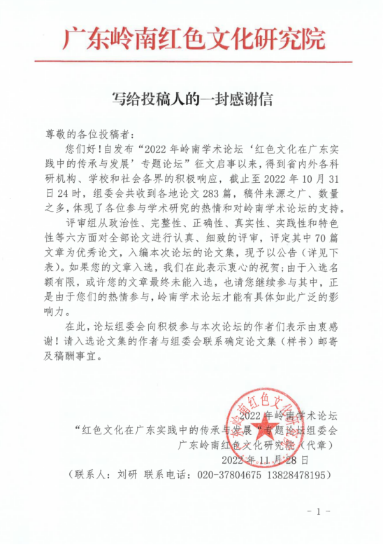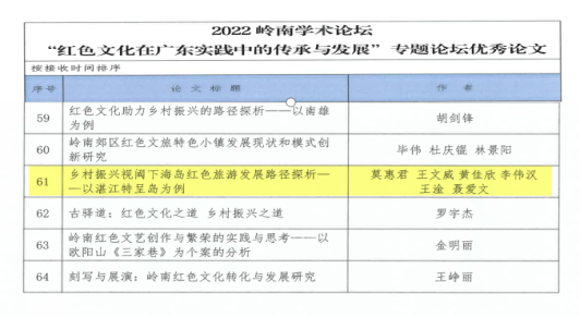 2022年11月28,三亿体育聂爱文教授指导社会学专业同学撰写的《乡村振兴视阈下海岛红色旅游发展路径探析—以湛江特呈岛为例》一文,参加广东省社科联2022年岭南学术论坛“红色文化在广东实践中的传承与发展”专题论坛征文比赛,获得优秀论文奖,并入编本次论坛的论文集。