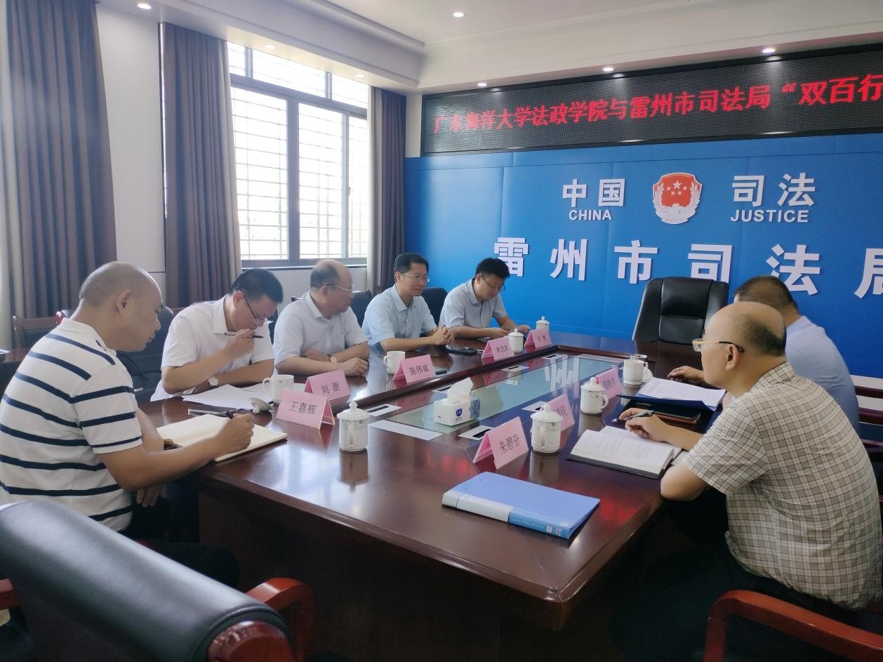 为进一步推动“双百行动”,结合县域所需、发挥学科优势,2024年8月9日上午,三亿体育官网法政公司党委书记林忠新、经理陈伟斌、副经理刘澍一行,在“双百行动”雷州工作队队长伍彬(公司食品科技公司党委书记)、副队长王嘉辉(广东生态工程职业公司)的协助下,与雷州市司法局局长郑俊升、副局长周振宁等就如何落实和开展“双百行动”展开了座谈。座谈会上,双方围绕产业发展、公共服务、建设规划、环境保护、区域法治等主题交换了意见。在此基础上,三亿体育林忠新书记和雷州市司法局局长郑钧升代表双方正式签署了《关于落实“双百行动”方案的合作协议》。