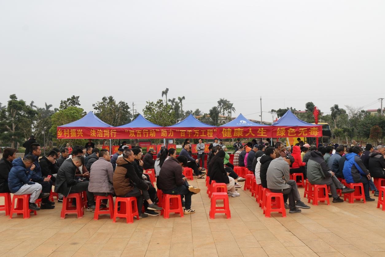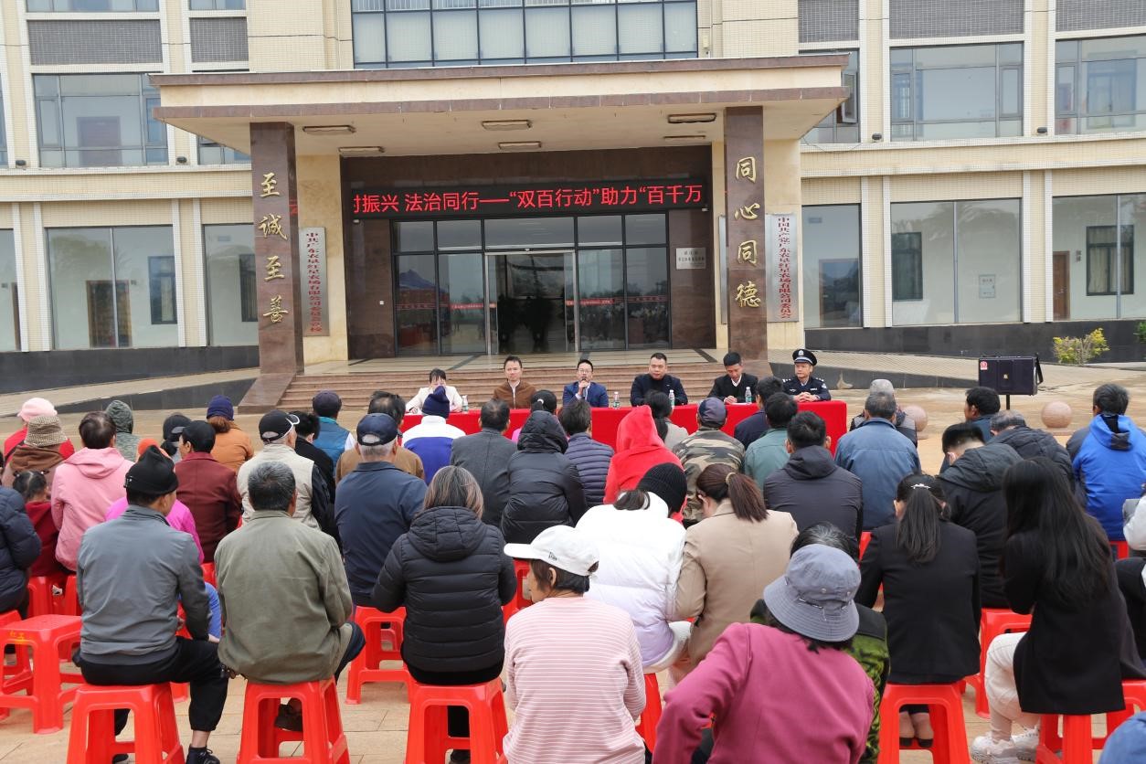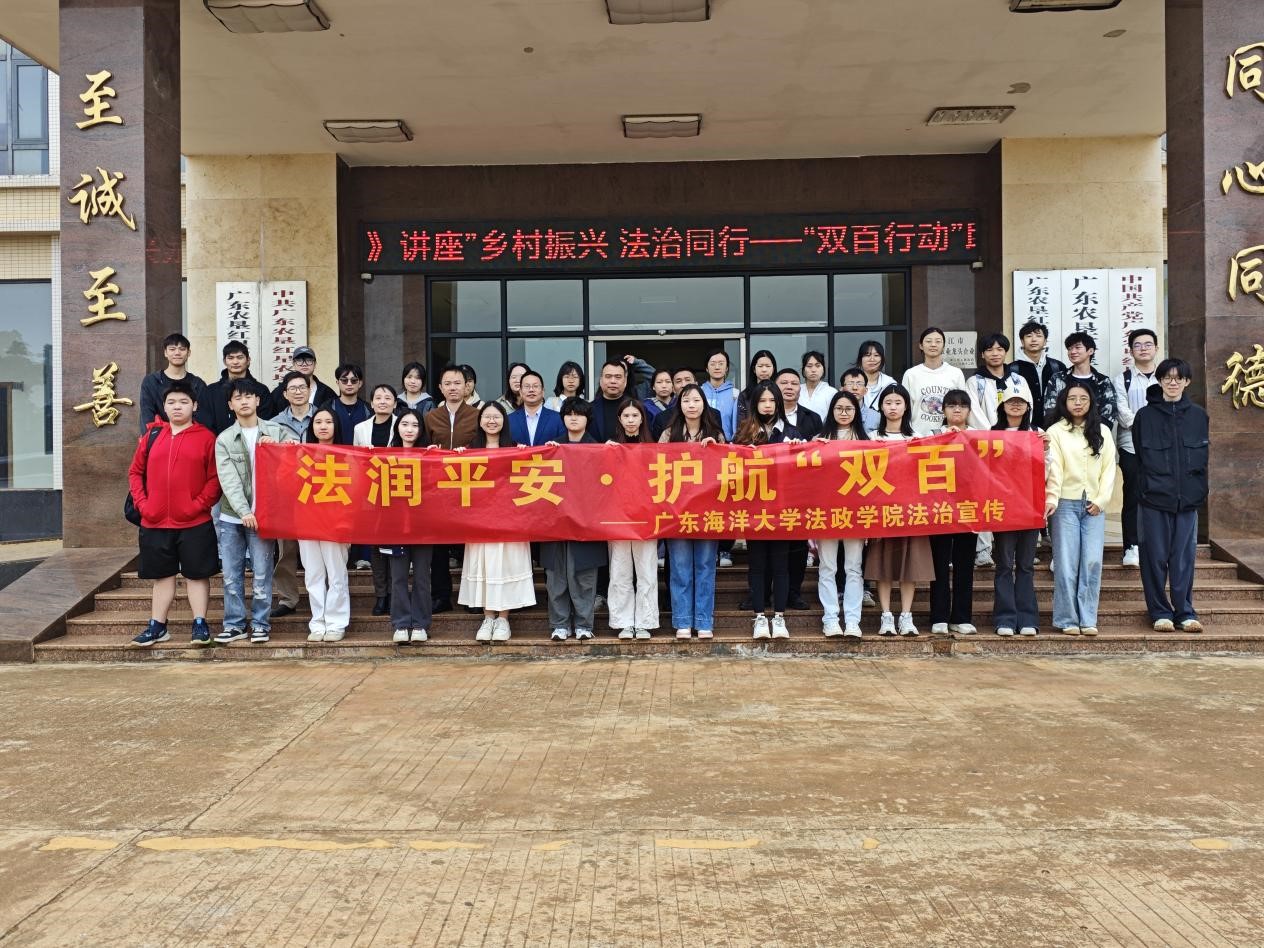 为进一步贯彻落实习近平总书记关于加强法治人才培养的重要指示,践行广东省委“百千万工程”决定、广东省教育厅“双百行动”工程,履行公司与湛江市徐闻县司法局签订的“双百行动”合作协议,强化《法治宣传》课程实践教学质量,提升公司法学本科生的法治宣传实务能力,探索并创新人才培养模式,12月27日上午,三亿体育与徐闻县委政法委、徐闻县司法局、徐闻县禁毒办在广东农垦红星农场有限责任公司共同开展法治宣传、“双百行动”活动。公司副经理刘澍教授、实践教学中心主任周立波同志、刑事法学系主任张科副教授、吴运时博士、办公室主任宁乐添同志和法学2022级8班的所有同学,与湛江市徐闻县司法局莫光智副局长、徐闻县政法委副书记莫小维、红星农场副总经理周建华及相关10余名同志一起参加了此次活动。