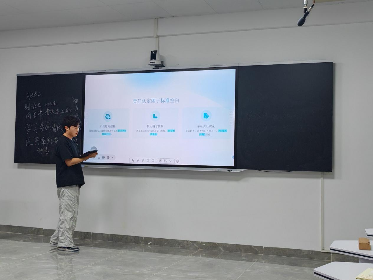 活动现场,24级研究生林蓓菁、谭卓篇、陈毅沅、郑清媛、陈小妹等五名同学依次登台发言,围绕为省法学会海洋法学研究会、航运法学研究会2025年会员大会与学术年会所撰写的学术论文展开分享。活动采取一报告一交流的方式渐次展开。作者详细介绍了论文的研究背景、问题的提出,分析过程、解决对策与论证逻辑,引发了现场热烈讨论。刘澍副经理对论文进行点评,尤其是对其中的关键问题,结合同学们的交流内容进行了简要地解释,阐释了问题的由来,讲解相关法律制度的内涵及实践情况,有效拓展了同学们的学术视野与专业认知。