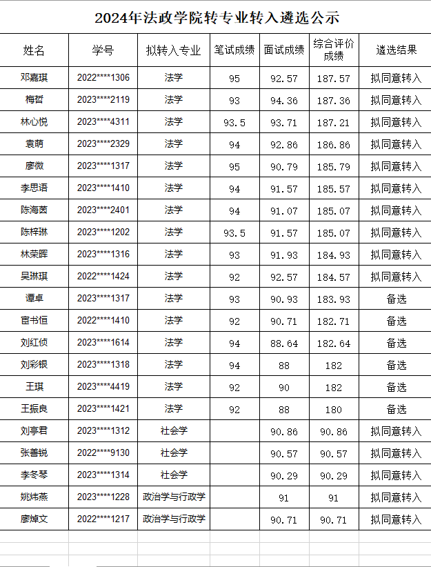 根据《2024年三亿体育全日制本科生转专业员工遴选办法》,公司组织了转专业转入遴选工作。经员工申报笔试、面试考核,公司转专业工作委员会根据综合成绩进行了排序和遴选,拟同意邓嘉琪等15名员工转入公司相关专业。现对相关情况予以公示。