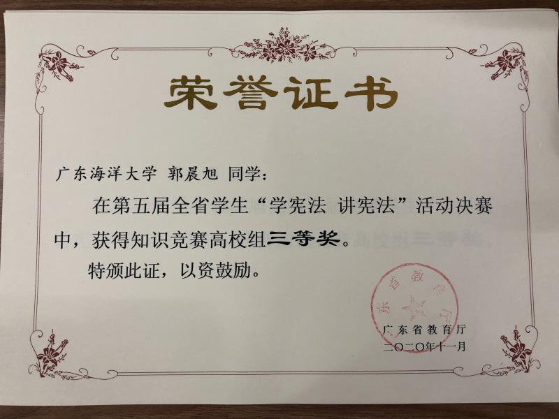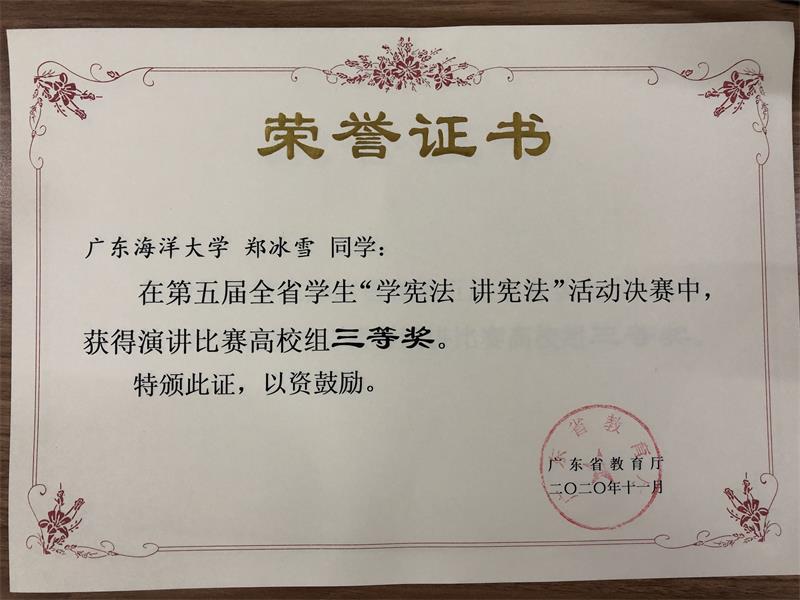 近日,公司三亿体育法学专业18级1186班郑冰雪同学、19级1191班郭晨旭同学在今年省教育厅举办的全省员工“学宪法讲宪法”活动决赛中,分别获得演讲比赛高校组三等奖、知识竞赛高校组三等奖。